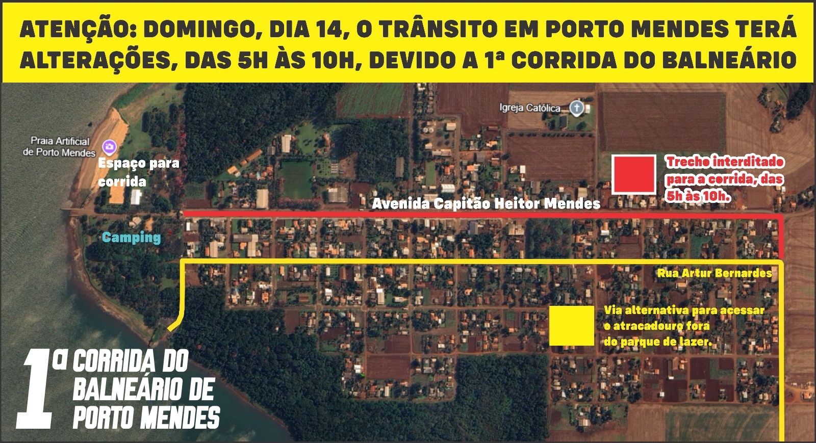 Em razão do evento, o trânsito em Porto Mendes passará por mudanças neste domingo, entre 5h e 10h. A Avenida Capitão Heitor Mendes estará interditada durante esse período. Motoristas que precisarem acessar o parque ou pescadores que utilizam a região deverão seguir pela rota alternativa da rua Artur Bernardes, até o atracadouro localizado fora do parque.