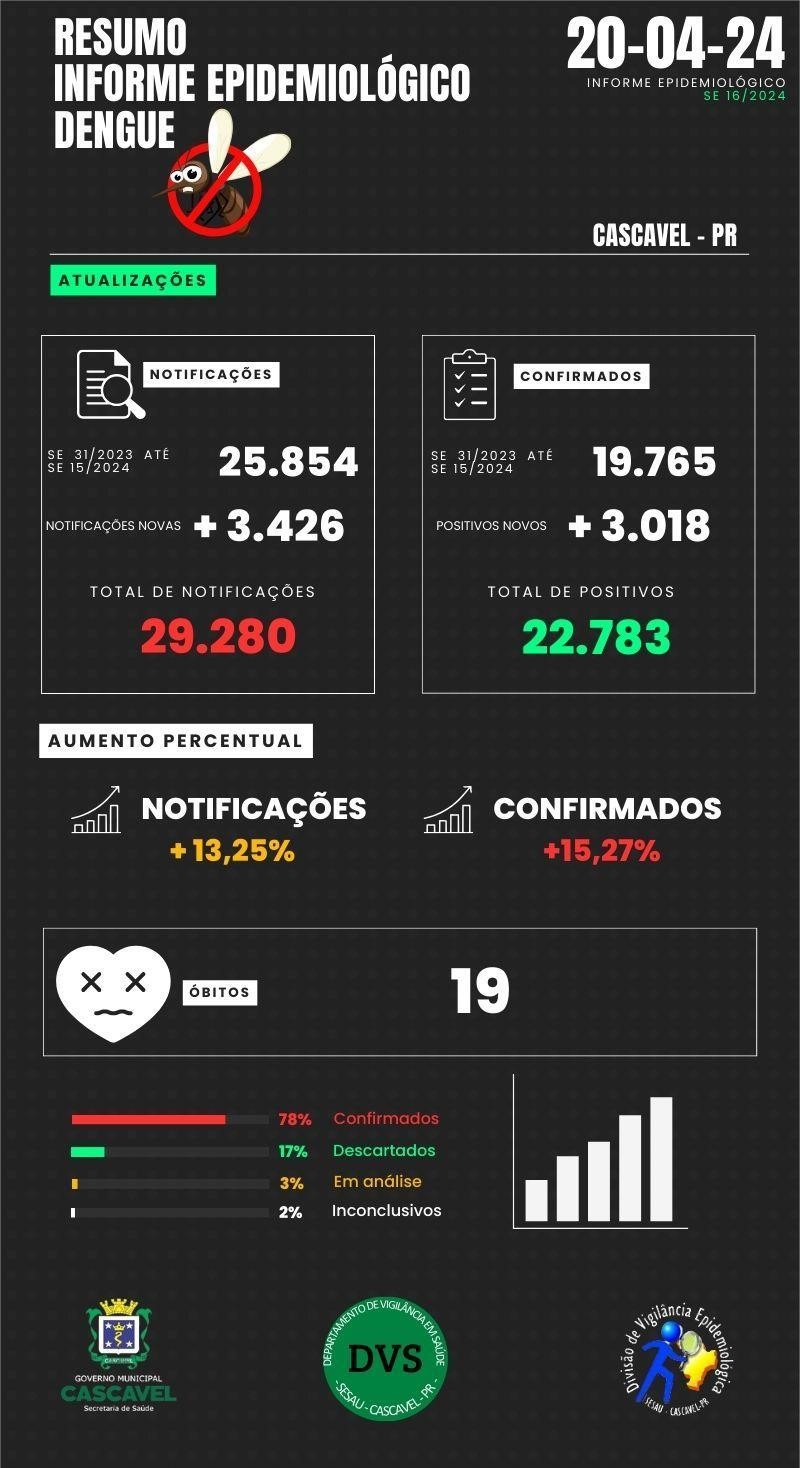Da última semana para esta, o município confirmou 3.018 novos casos da doença, chegando a 22,7 mil. Ao todo, são 19 óbitos. De acordo com o secretário, 25 mortes são investigadas pelo Laboratório Central do Estado do Paraná (Lacen).