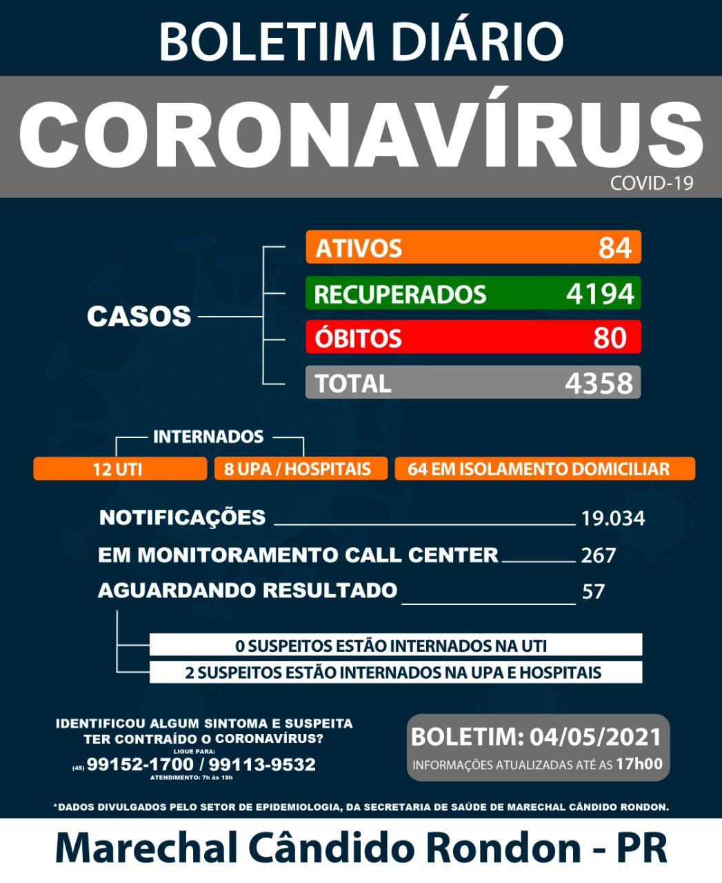Boletim divulgado às 17 horas desta terça-feira pelo Setor de Epidemiologia da Secretaria Municipal de Saúde confirmou que um homem de 54 anos é o 80º óbito por Covid-19 em Marechal Cândido Rondon.
