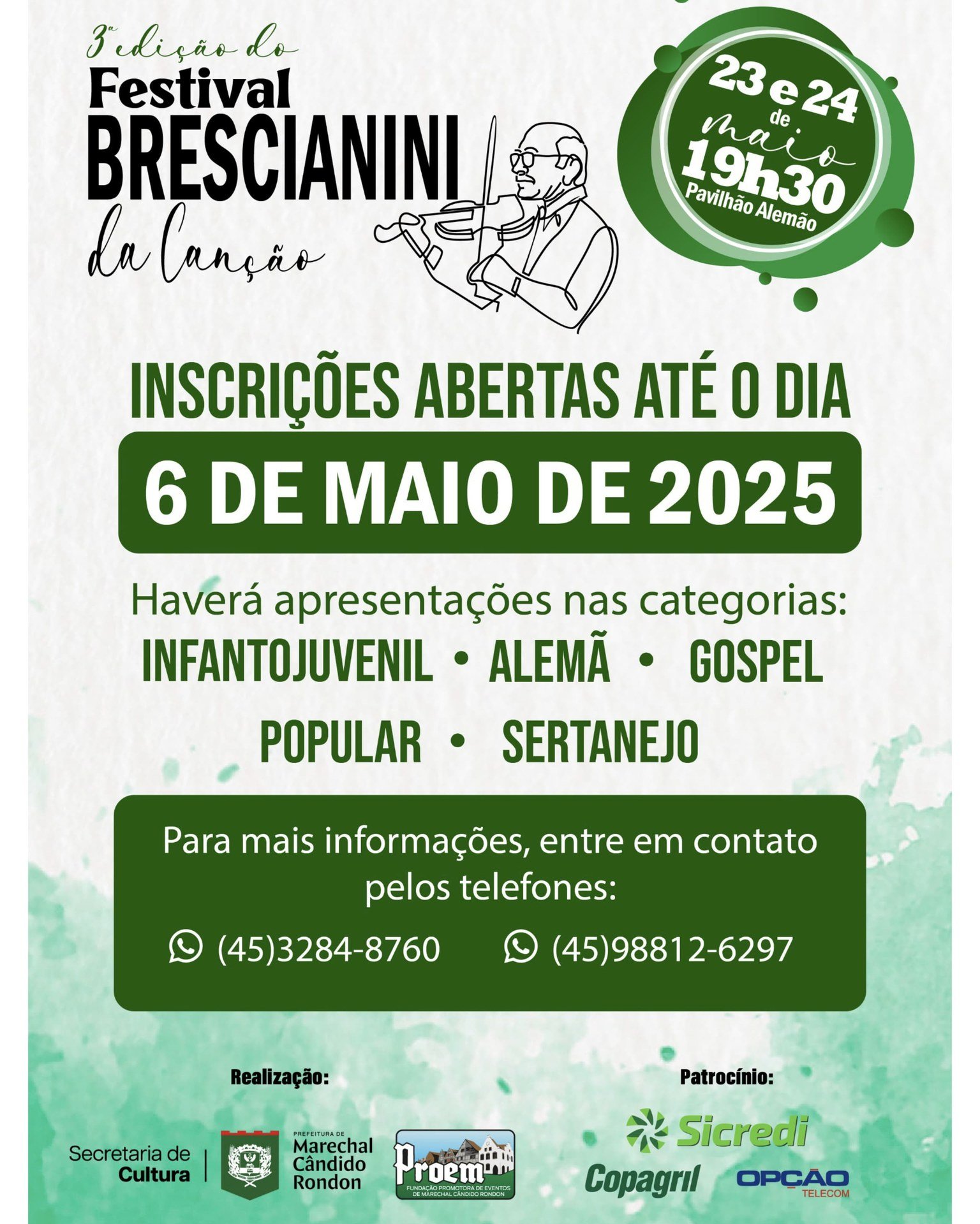 Os artistas interessados em participar do 3º Festival Brescianini da Canção têm até o dia 6 de maio para realizar suas inscrições. O evento musical, de participação popular, tem como objetivo valorizar os artistas locais e regionais, além de promover a difusão das músicas brasileira e alemã.