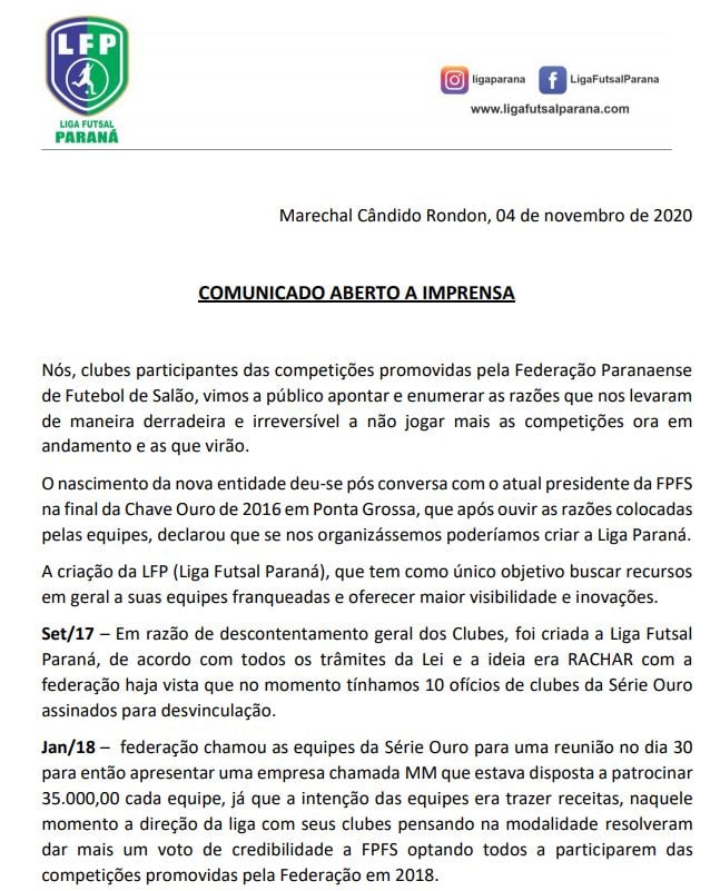 Set/17 – Em razão de descontentamento geral dos Clubes, foi criada a Liga Futsal Paraná, de acordo com todos os trâmites da Lei e a ideia era RACHAR com a federação haja vista que no momento tínhamos 10 ofícios de clubes da Série Ouro assinados para desvinculação.