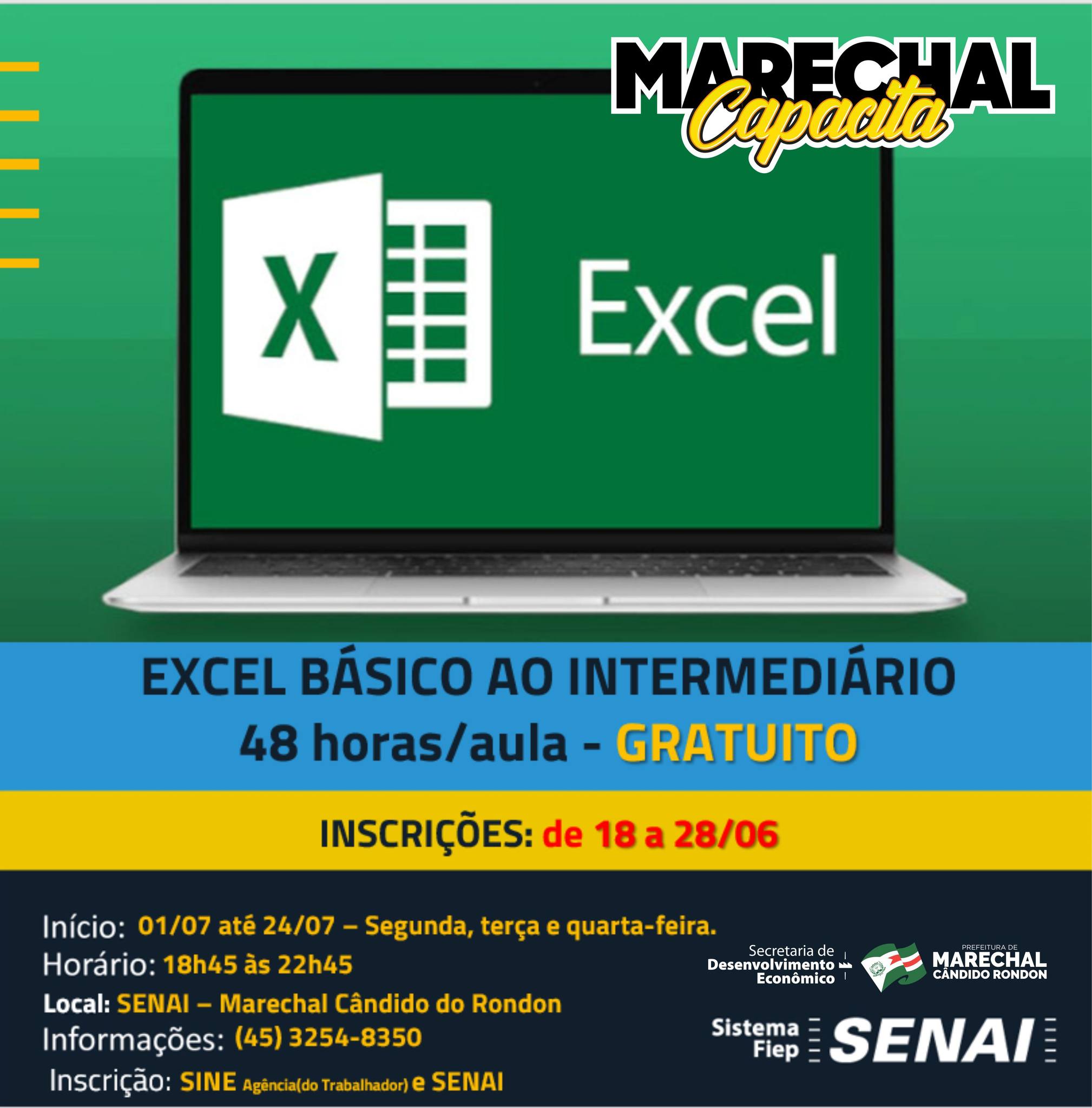 Estão abertas as inscrições para o curso gratuito de Excel Básico ao Intermediário em Marechal Cândido Rondon, que terá um total de 48 horas/aula. Trata-se de uma parceria entre prefeitura, através da Secretaria de Desenvolvimento Econômico, e o SENAI. Para participar da capacitação, é necessário o cadastramento até o dia 28 de junho, no SINE (Agência do Trabalhador) ou no SENAI. Entre os pré-requisitos, estão ter idade mínima de 15 anos e o ensino fundamental completo.