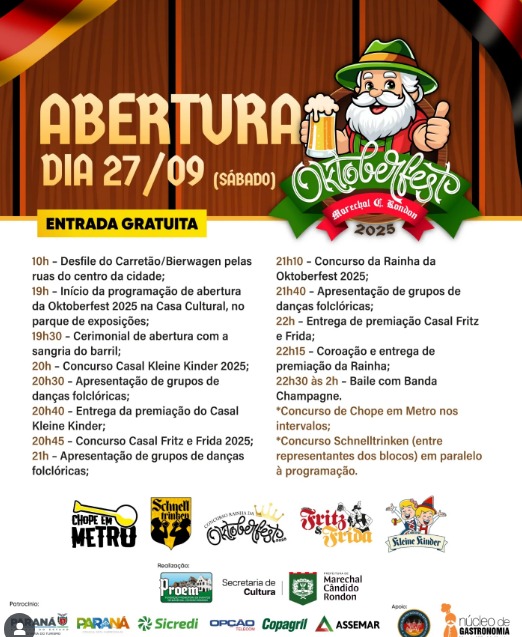 Vai começar o retetê! Neste sábado, dia 27 de setembro, Marechal Cândido Rondon dará início à tradicional Oktoberfest, evento que ao longo de todo o mês de outubro contará com diversas atrações alusivas à cultura alemã. A programação de abertura começa já pela manhã, às 10h, com o desfile de bandinha sobre o carretão por ruas/avenidas do centro da cidade, com distribuição de chope.
