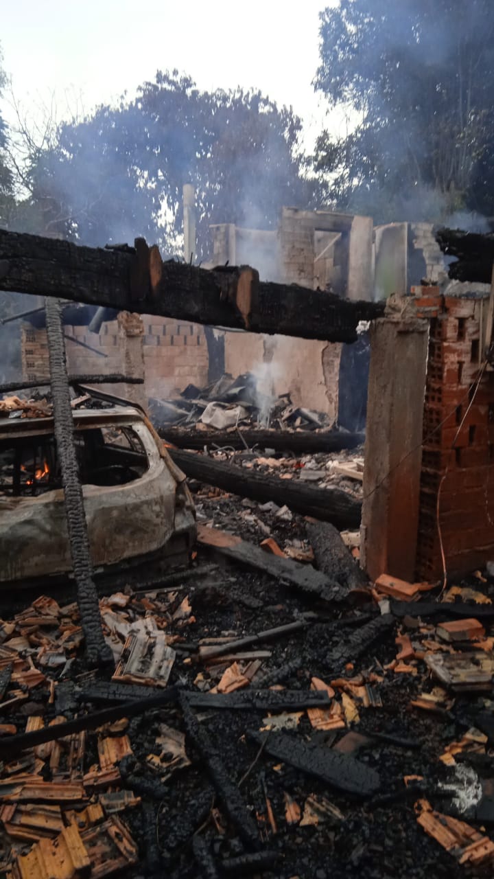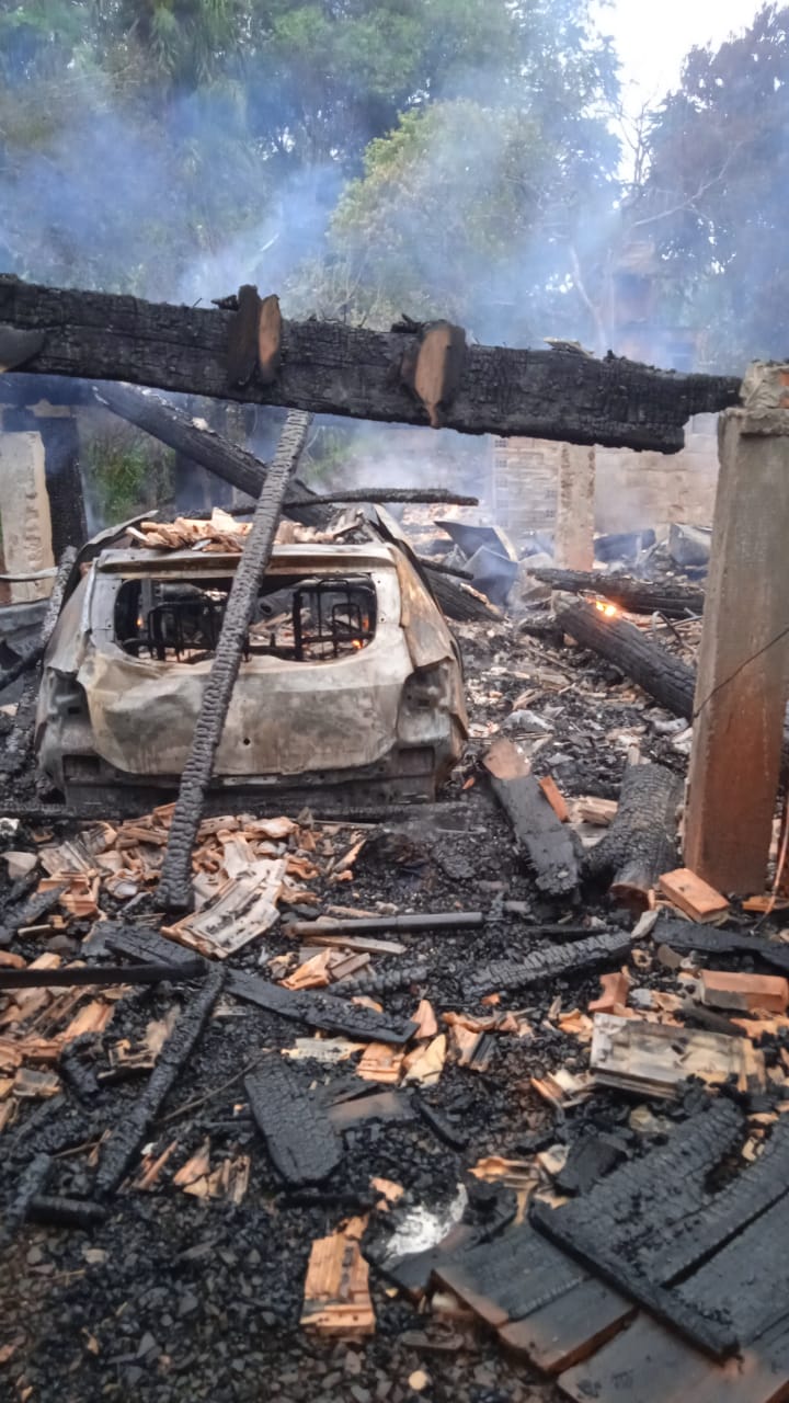 Além da moradia, um veículo Sandero que estava no porão da casa também foi totalmente destruído pelo fogo.