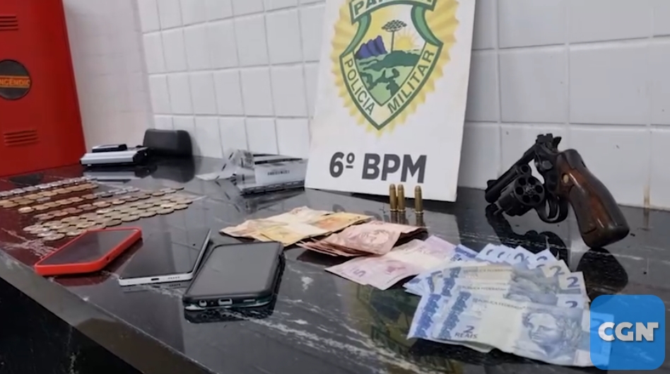Durante a revista pessoal e a busca no interior do veículo, os policiais localizaram um revólver calibre .38 com três munições intactas, além de uma quantia em dinheiro e três aparelhos celulares sem procedência comprovada. Todo o material foi apreendido no local.