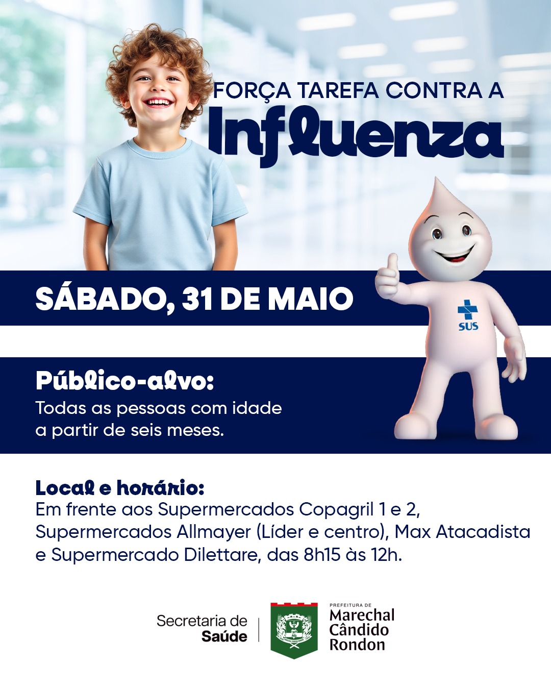Considerando o aumento de casos de síndromes respiratórias e do vírus sincicial respiratório, que têm elevado os atendimentos em todas as unidades de saúde e também na Unidade de Pronto Atendimento (UPA), a Secretaria de Saúde de Marechal Cândido Rondon reforça a importância da vacinação para todas as faixas etárias, com o objetivo de ampliar a proteção e reduzir complicações. Neste sábado (31), mais uma ação visa intensificar a vacinação contra a influenza. As doses do imunizante estarão disponíveis das 8h15 às 12h, para a população nos seguintes pontos do município: