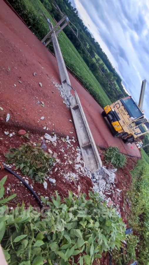 O condutor de uma camionete Hilux SRV preta perdeu o controle da direção e bateu contra um poste na entrada de uma propriedade rural vizinha, o poste ficou caído na via.