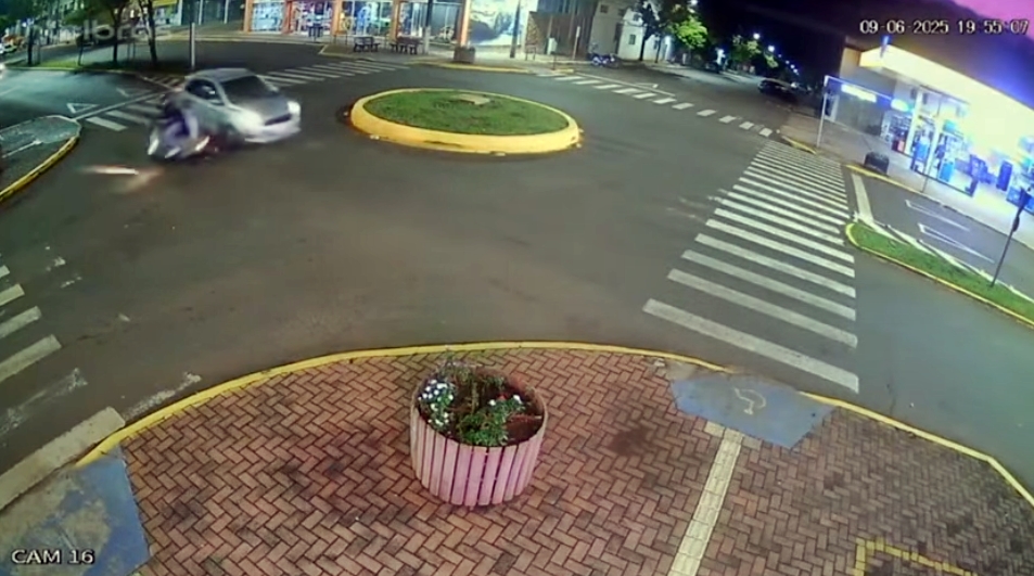 Acidente em rotatória do centro de Marechal Rondon deixa jovem e criança feridas