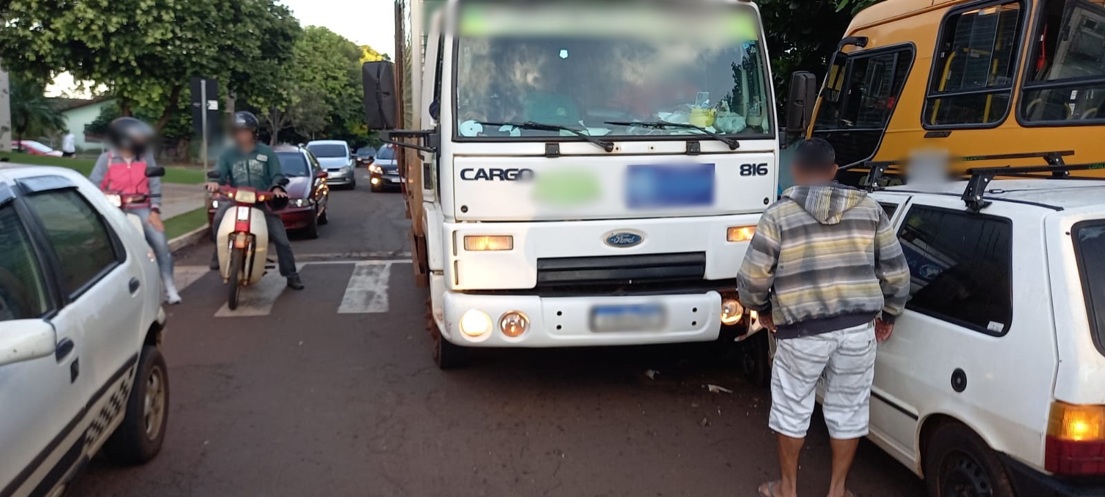 Acidente de trânsito foi registrado na manhã desta sexta-feira (28) na Rua Belém, Bairro Botafogo, em frente a uma escola municipal. O acidente envolveu um Fiat Uno, um caminhão Ford Cargo e um ônibus Volswagem.