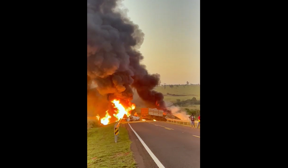 Um vídeo gravado por um motorista que transitava pela rodovia, e que circula no whatsapp  mostra duas carretas em chamas e  uma explosão momentos mais tarde.