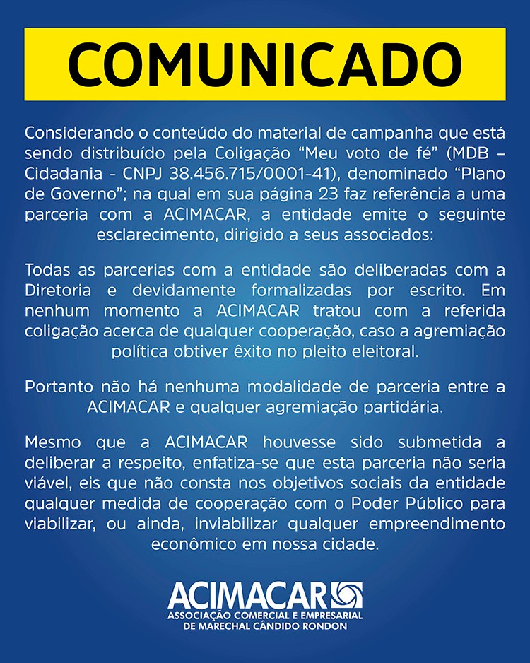 A manifestação da entidade ocorreu após a coligação divulgar o plano de governo, em que na página 23 constam as seguintes frases: “Valorização da Acimacar, gerando grande parcerias” e “Viabilizar a instalação de shopping center para Mal. Cândido Rondon em parceria com a Acimacar”.
