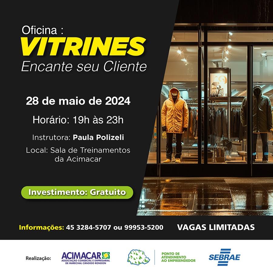 Para auxiliar empresários e seus colaboradores a planejarem e executarem a vitrine de suas empresas e fecharem ainda mais negócios, a Associação Comercial e Empresarial de Marechal Cândido Rondon (Acimacar) promove, hoje, terça-feira, uma oficina gratuita com o tema “Vitrines – encante seu cliente”.