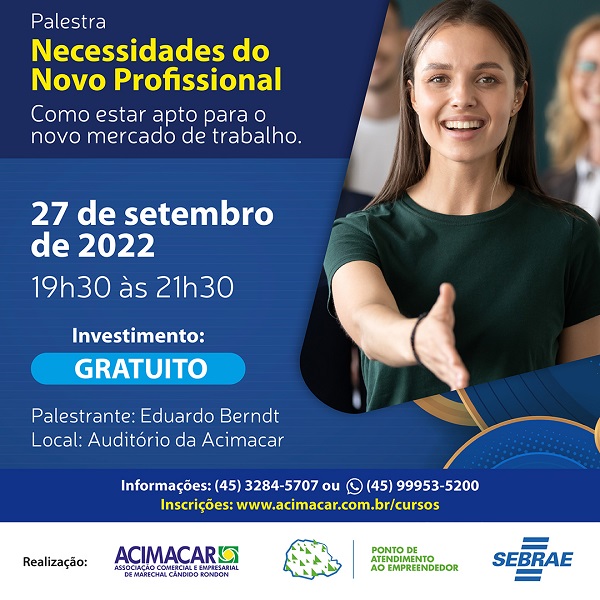 Para responder a este e outros questionamentos, a Associação Comercial e Empresarial de Marechal Cândido Rondon (Acimacar) promove a palestra “Necessidades do novo profissional: como estar apto para o novo mercado de trabalho”.