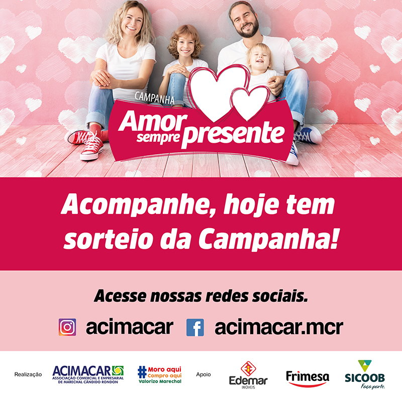A Associação Comercial e Empresarial de Marechal Cândido Rondon sorteia hoje os vales-compras da campanha Amor Sempre Presente, promovida pela entidade em parceria a Edemar Imóveis, Sicoob Marechal e Frimesa.