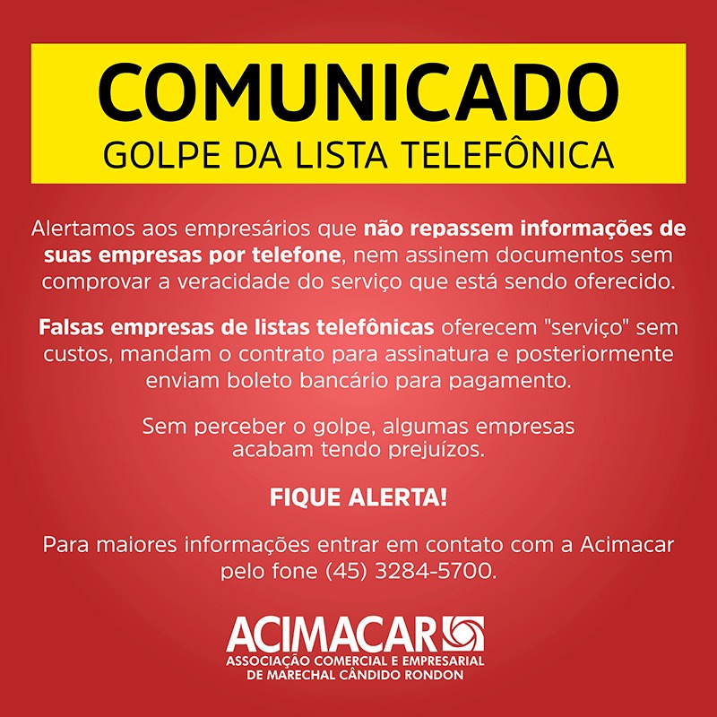 A Associação Comercial e Empresarial de Marechal Cândido Rondon está reforçando e cobrando maior atenção dos empresários, quanto a pratica de novos golpes da lista telefônica.