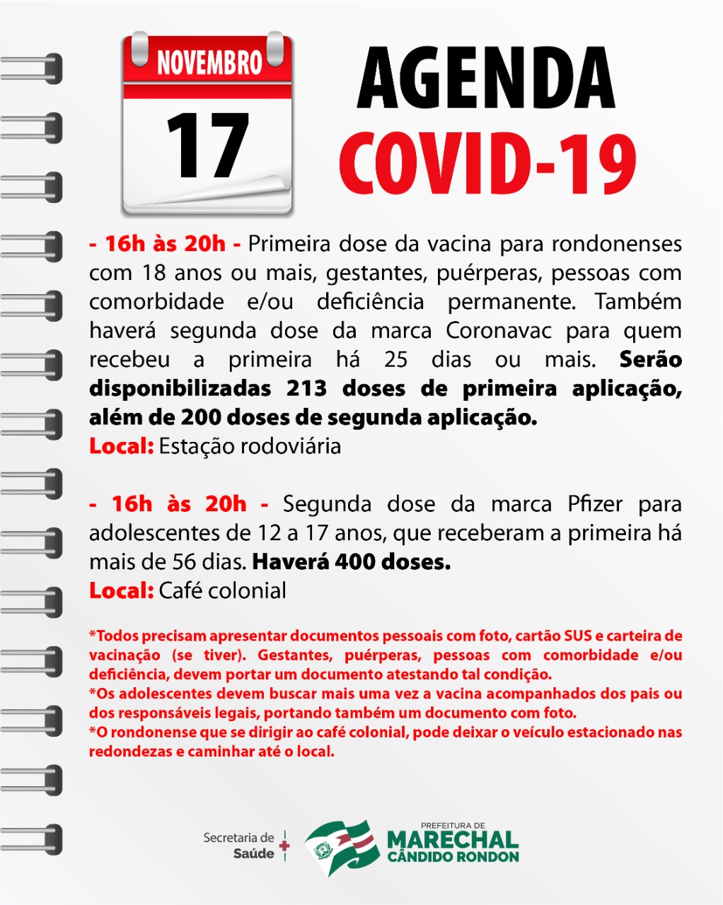 Os adolescentes rondonenses que receberam a primeira dose da vacina da marca Pfizer contra a Covid-19 no intervalo de 56 dias completos ou mais têm direito à segunda dose. A vacina será aplicada nesta quarta-feira (17), no horário das 16h às 20h, nas dependências do café colonial de Marechal Cândido Rondon. Este será o início da aplicação da segunda dose no público dos 12 aos 17 anos de idade. Serão disponibilizadas 400 doses neste dia.