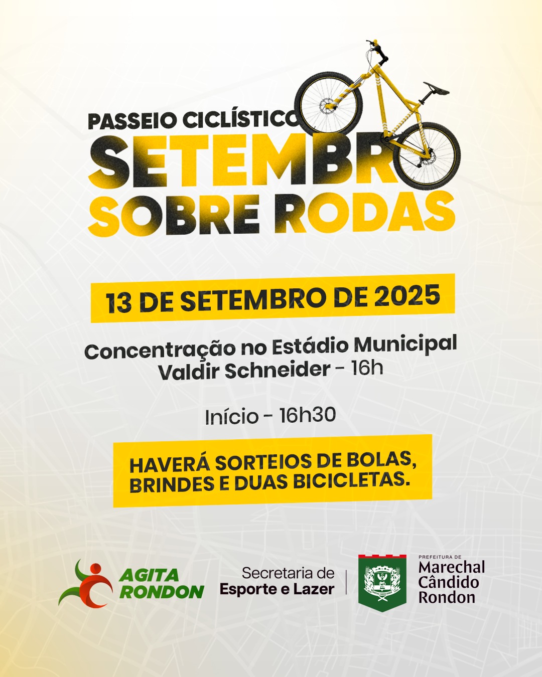 A programação do Agita Rondon 2025 segue com força total, e a próxima atração promete movimentar ainda mais Marechal Cândido Rondon. No dia 13 de setembro (sábado), acontece o “Setembro Sobre Rodas”, um passeio ciclístico pelas ruas da região central do município, que promete reunir famílias, amigos e amantes do esporte em uma atividade saudável, divertida e cheia de energia positiva.
