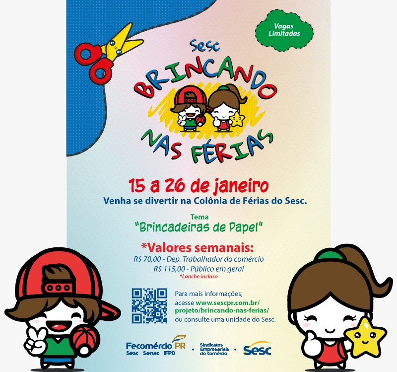 Rafael Hupper convida os interessados em inscrever seus filhos na Colonia de Ferias, para que comparecam na sede do Sesc ainda hoje ou amanha e façam a matricula, pois ainda os valores são promocionais neste período.