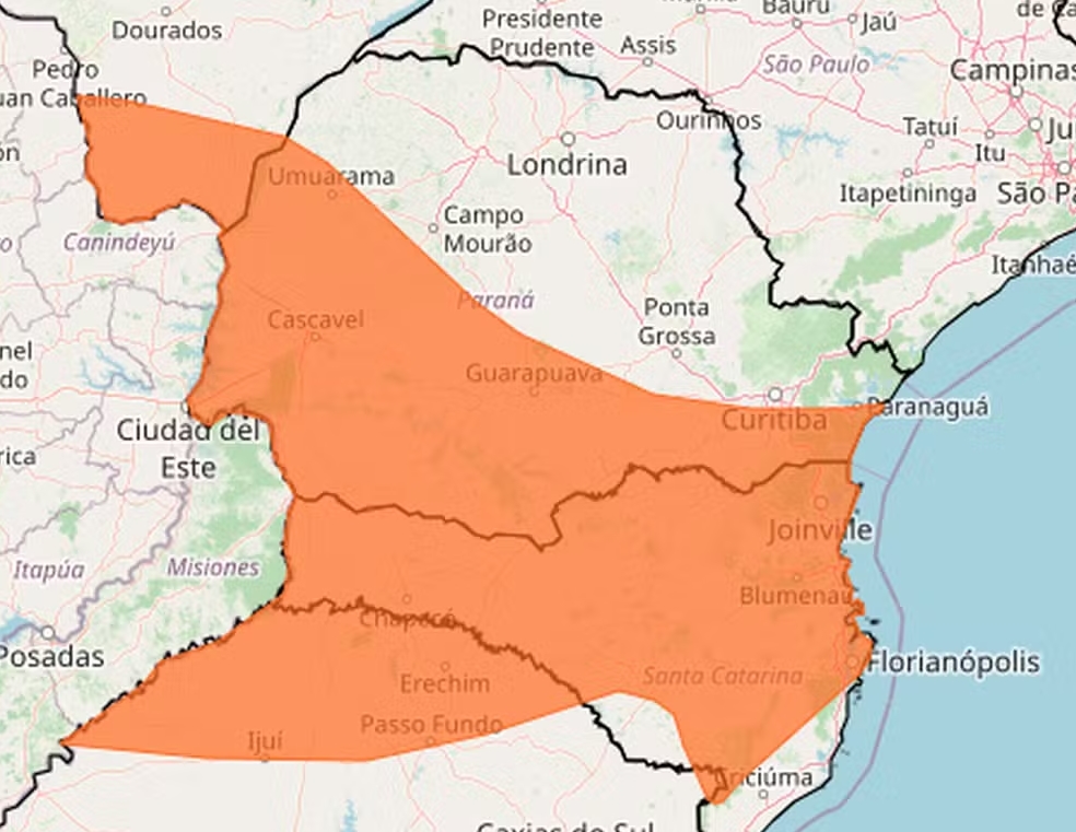 Ele indica a possibilidade de ventos de até 100 km/h, queda de granizo e chuva de até 60 milímetros por hora ou 100 mm por dia. Com isso, há risco de corte de energia elétrica, estragos em plantações, queda de árvores e alagamentos, alerta o Instituto.