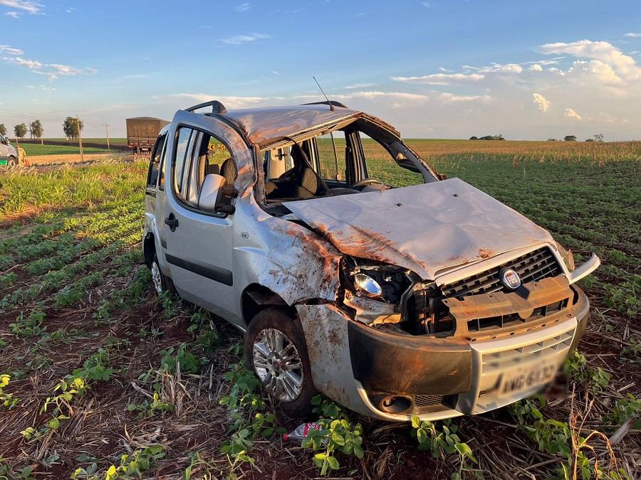 Ao tentar ultrapassar em faixa dupla, condutora sai da pista e capota carro na 182 em Maripá