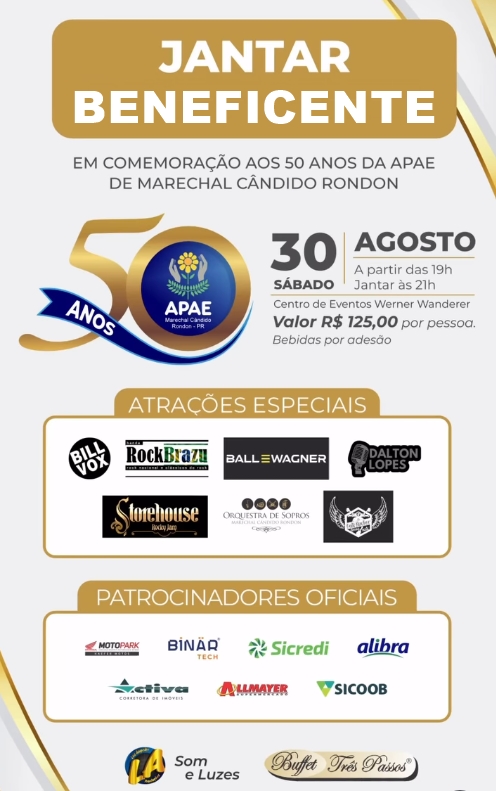 A APAE de Marechal Cândido Rondon comemora meio século de história com um grande Jantar Beneficente, marcado para o próximo dia 30 de agosto, sábado, no Centro de Eventos Werner Wanderer.