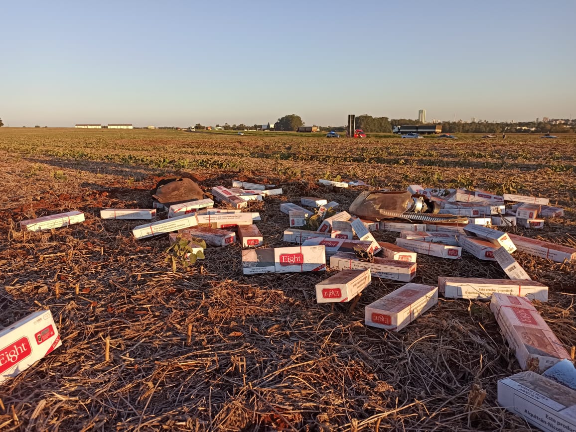 A Policia Rodoviária Federal apreendeu, na tarde de hoje (29) 22.500 maços de cigarros contrabandeados transportados em uma Santa Fé roubada. O condutor desobedeceu a tentativa de abordagem na BR 467, em Toledo/PR, e empreendeu fuga em alta velocidade.