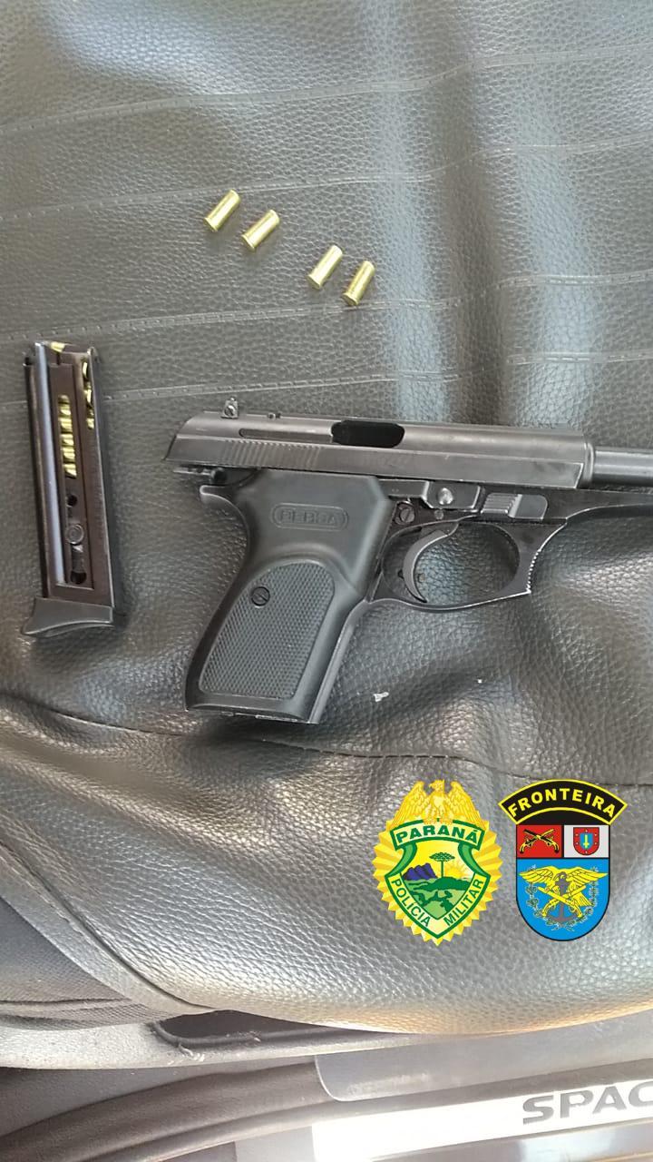 Na tarde de segunda-feira, (03), em ação da Operação Hórus, Policiais Militares do BPFron – Batalhão de Polícia de Fronteira, em patrulhamento na cidade de Marechal Rondon, realizaram abordagem em um veículo VW/Amarok de cor preta, durante a revista do automóvel, foi localizado no banco traseiro uma pistola calibre .22 e um carregador com nove munições intactas e quatro cápsulas de munição deflagradas.