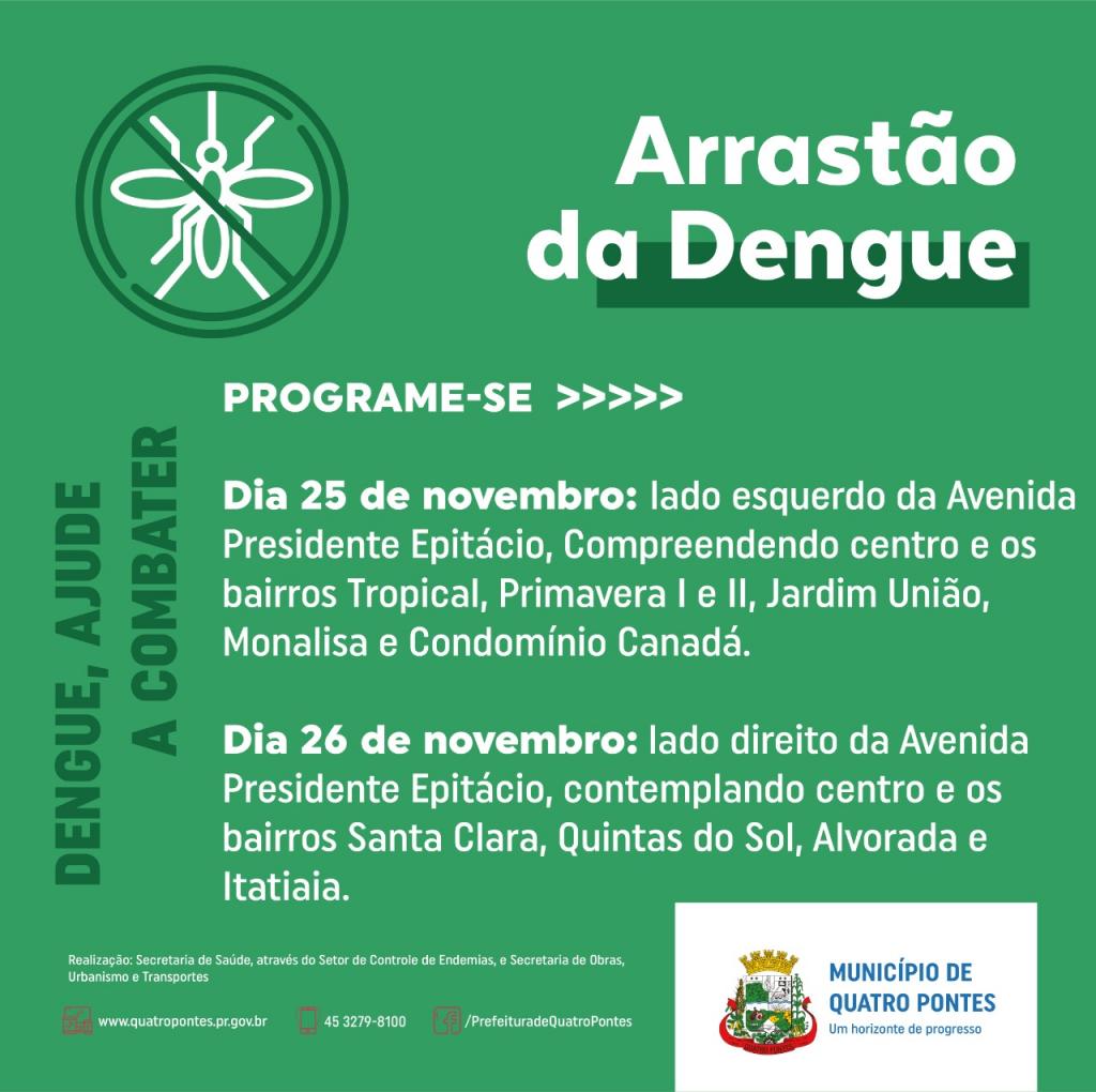 Está programada para hoje e amanhã, em Quatro Pontes, a realização do “Arrastão da Dengue”, ação organizada pela Secretaria de Saúde, através do Setor de Controle de Endemias, e a Secretaria de Obras, Urbanismo e Transportes.