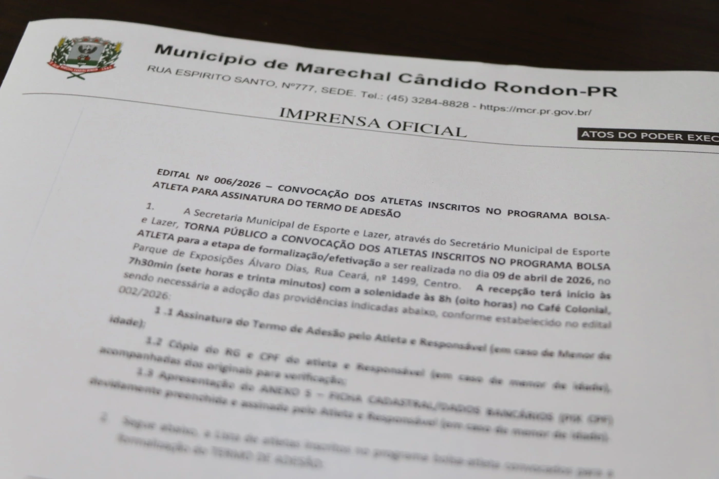 A prefeitura de Marechal Cândido Rondon, por meio da Secretaria de Esporte e Lazer, informa que a assinatura dos termos de adesão dos esportistas classificados no programa Bolsa-Atleta 2026 será realizada nesta quinta-feira (9), a partir das 7h30, no Café Colonial, localizado no parque de exposições.
