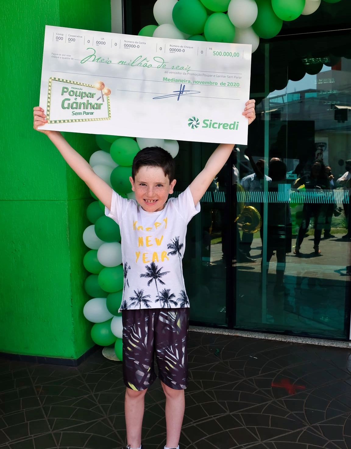 Com objetivo de incentivar o planejamento financeiro dos associados, a campanha “Poupar e Ganhar sem Parar”, promovida pelo Sicredi nos estados do Paraná, São Paulo e Rio de Janeiro, contemplou o jovem Vinicius Poli, de nove anos, morador do município de Medianeira (PR), com R$ 500 mil. O sorteio especial, realizado no dia 31 de outubro, celebrou o Dia Mundial da Poupança e foi divulgado no dia 5 de novembro, após o parecer da auditoria externa, que realiza a validação do sorteio.