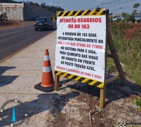A Polícia Rodoviária Federal solicita a atenção de todos os usuários da BR-163, pois a rodovia será interditada parcialmente no dia 31 deste mês de agosto.