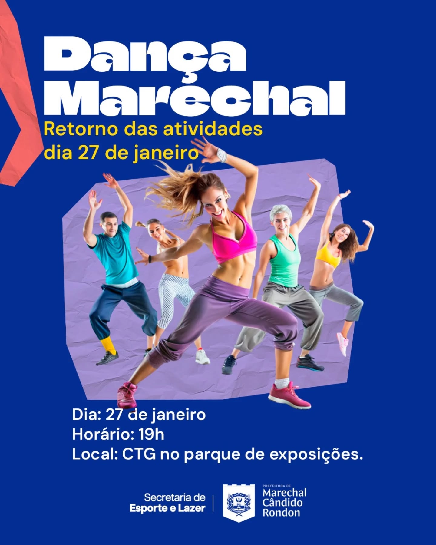 A prefeitura de Marechal Cândido Rondon, por meio da Secretaria Municipal de Esporte e Lazer, informa que as atividades do projeto Dança Marechal serão retomadas nesta terça-feira, dia 27 de janeiro, a partir das 19h, no pavilhão do CTG, no parque de exposições.