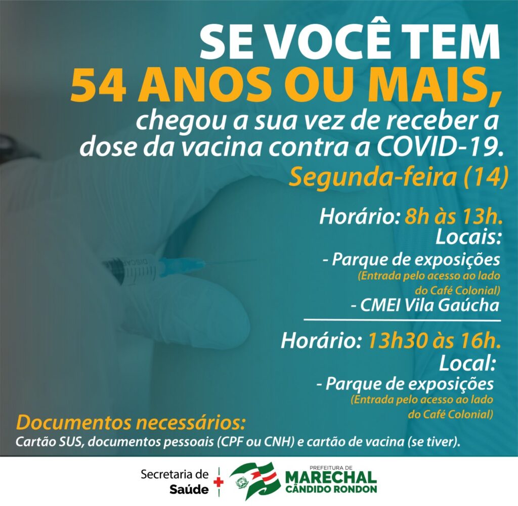 Nesta segunda-feira (14) o cronograma de vacinação em Marechal Rondon terá seqüência para pessoas com 54 anos ou mais. Mais uma vez, na parte da manhã, das 8h às 13h, haverá dois pontos de imunização: CMEI Vila Gaúcha e Parque de Exposições. No período da tarde, das 13h30 às 16h, a imunização será somente no […]