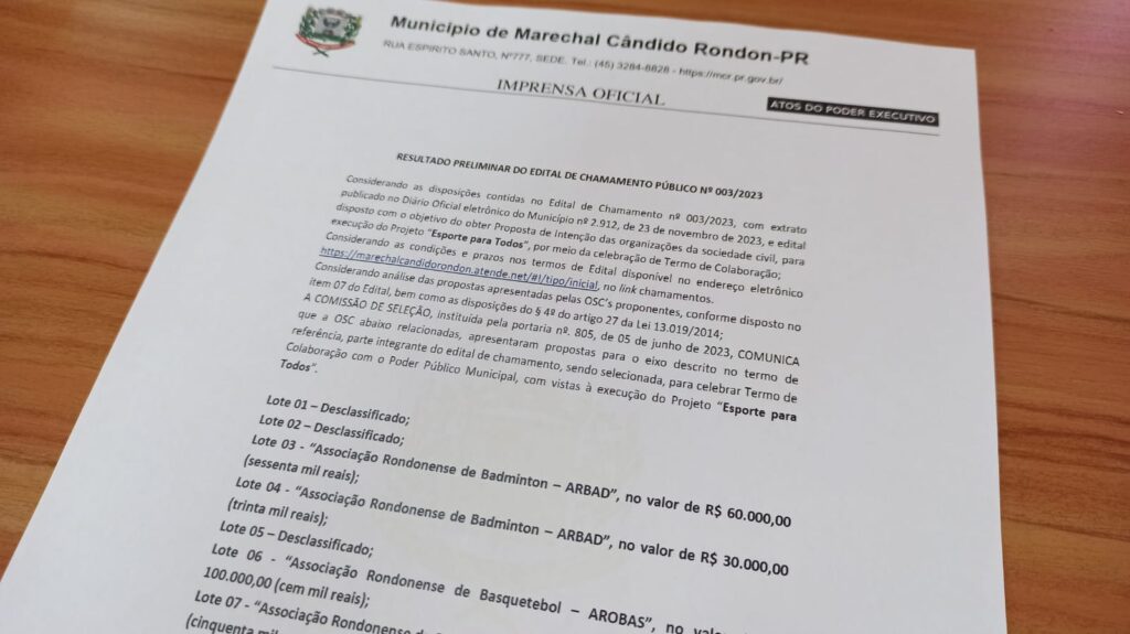 Está publicado na edição desta sexta-feira (12) do Diário Oficial Eletrônico do município de Marechal Cândido Rondon, o Edital de Chamamento nº 003/2023, contendo a relação de organizações da sociedade civil selecionados para a execução do projeto Esporte para Todos. A iniciativa será viabilizada por meio da celebração de termo de colaboração. A lista de […]