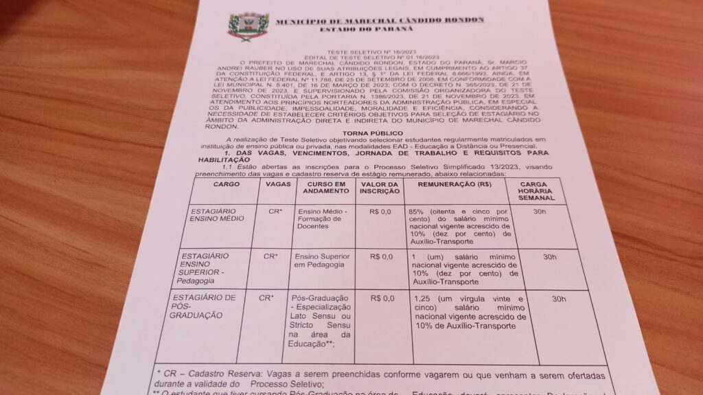 Encontram-se abertas até o próximo dia 12, as inscrições ao teste seletivo nº 16/2023, que objetiva selecionar estudantes regularmente matriculados em instituição de ensino pública ou privada, na modalidade EAD (Educação à Distância) ou presencial. As inscrições serão realizadas unicamente por meio da internet, no endereço https://marechalcandidorondon.atende.net/…/inscricao…. As vagas disponibilizadas pela prefeitura de Marechal Cândido […]