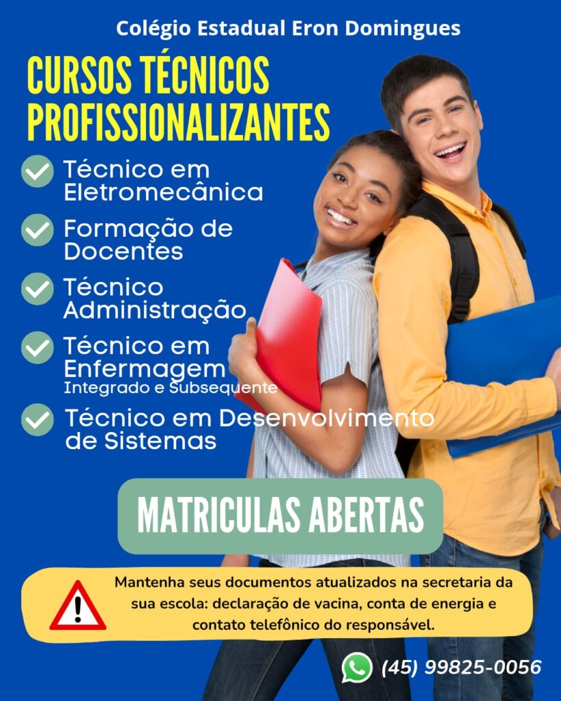 O Colégio Estadual Eron Domingues, de Marechal Cândido Rondon, ainda dispõe de vagas para matrícula em seus cursos técnicos de nível médio, voltados a estudantes que concluíram o 9º ano em 2025 e iniciarão a 1ª série do ensino médio em 2026. As oportunidades são para os cursos de Formação Docente, Enfermagem, Desenvolvimento de Sistemas […]