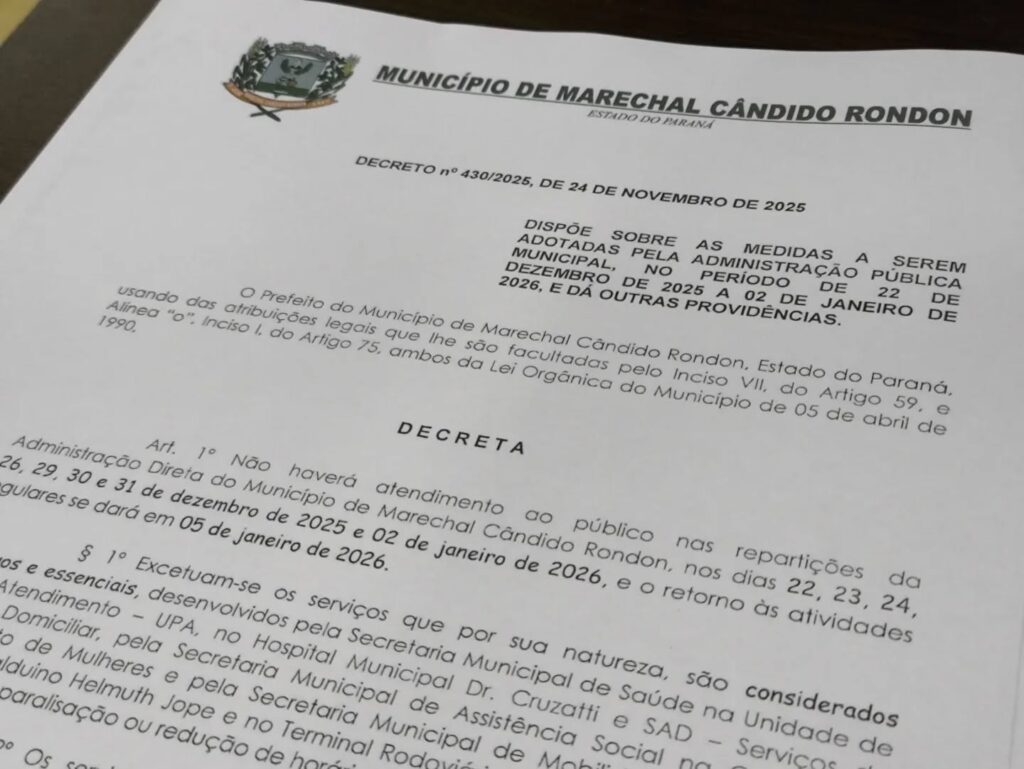 A prefeitura de Marechal Cândido Rondon, por meio de decreto publicado recentemente no Diário Oficial Eletrônico, definiu as medidas a serem adotadas nas repartições públicas durante o final de 2025 e o início de 2026. Não haverá atendimento ao público nas repartições da Administração Direta do Município de Marechal Cândido Rondon, nos dias 22, 23, […]