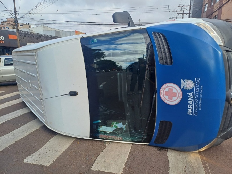 Van da Saúde de São Pedro do Iguaçu tomba após colisão em cruzamento no Centro de Toledo
