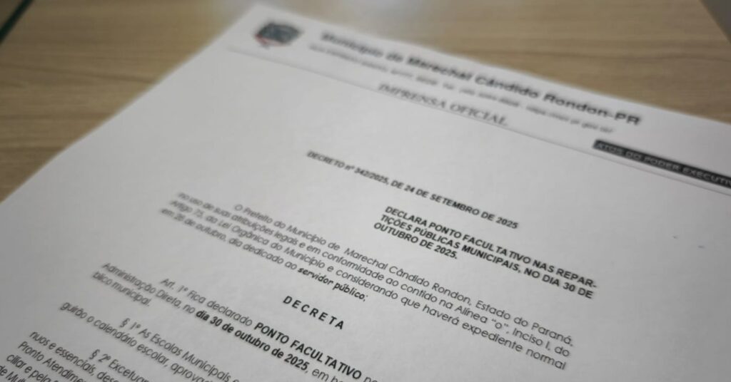 A prefeitura de Marechal Cândido Rondon informa que, conforme o Decreto nº 342/2025, o dia 30 de outubro (próxima quinta-feira) será ponto facultativo nas repartições públicas municipais, em homenagem ao funcionalismo público. O decreto considera que haverá expediente normal no dia 28 de outubro, data dedicada ao servidor público, e define que as atividades serão […]
