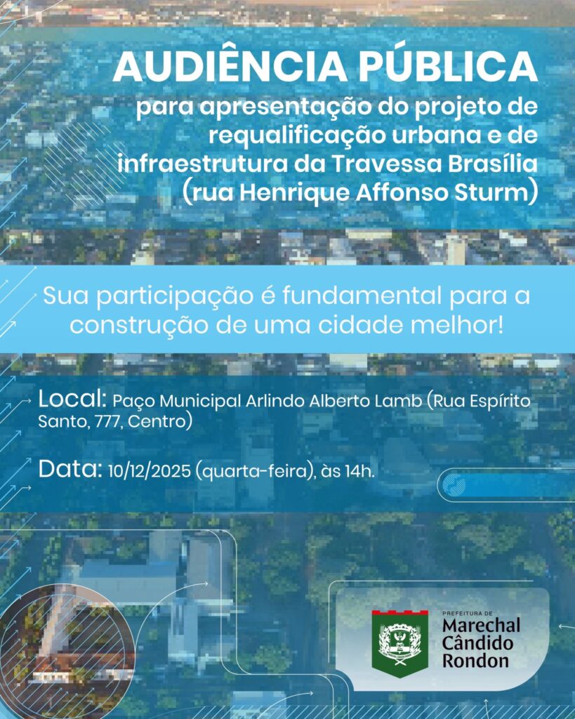 A prefeitura de Marechal Cândido Rondon, por meio da Secretaria de Planejamento, realizará nesta quarta-feira (10) uma audiência pública para apresentação do projeto de requalificação urbana e de infraestrutura da Travessa Brasília (rua Henrique Affonso Sturm) e do entorno da Praça Willy Barth. O encontro será às 14h, no auditório do paço municipal, localizado na […]