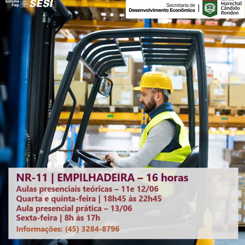 A prefeitura de Marechal Cândido Rondon, por meio da Secretaria de Desenvolvimento Econômico, em parceria com o SESI/SENAI, com o apoio da indústria Alibra, está com inscrições abertas para mais dois cursos: NR-11 Empilhadeira e NR-11 Paleteira Elétrica. Para operadores de empilhadeira, a capacitação terá carga horária de 16 horas/aula, sendo as aulas teóricas presenciais […]