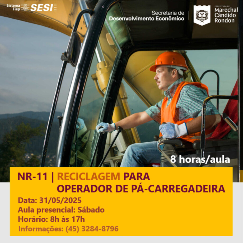 A Secretaria de Desenvolvimento Econômico de Marechal Cândido Rondon abriu as inscrições para a reciclagem do curso NR-11 destinado a operadores de pá-carregadeiras. O curso é exclusivo para aqueles que já possuem formação em NR-11 para operação de pá-carregadeira. A capacitação é gratuita e será realizada no sábado, dia 31 de maio, no SENAI e […]