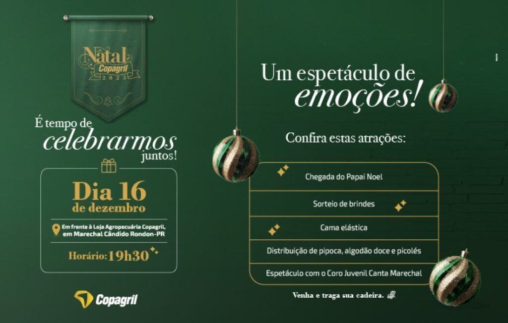 Nesta terça-feira, 16 de dezembro, a partir das 19h30, a Avenida Maripá será transformada em um grande cenário iluminado para receber mais uma edição do Natal Copagril. O evento, aberto ao público, acontecerá em frente à Loja Agropecuária Copagril, em Marechal Cândido Rondon, e promete reunir famílias em uma noite de encanto, emoção e celebração.A […]