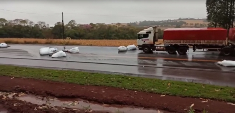 O trânsito está lento no local, com o caminhão e sacas sobre a pista.