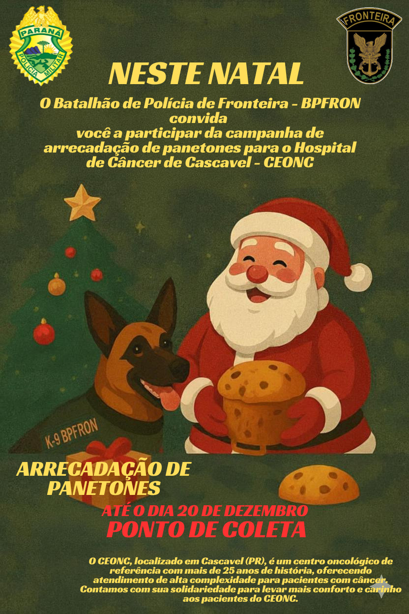O Batalhão de Polícia de Fronteira (BPFron) e do Pelotão de Operações com Cães da Policia Militar do Paraná, desenvolve uma campanha especial de Natal para arrecadar panetones que serão destinados aos pacientes do Hospital do Câncer de Cascavel (CEONC).