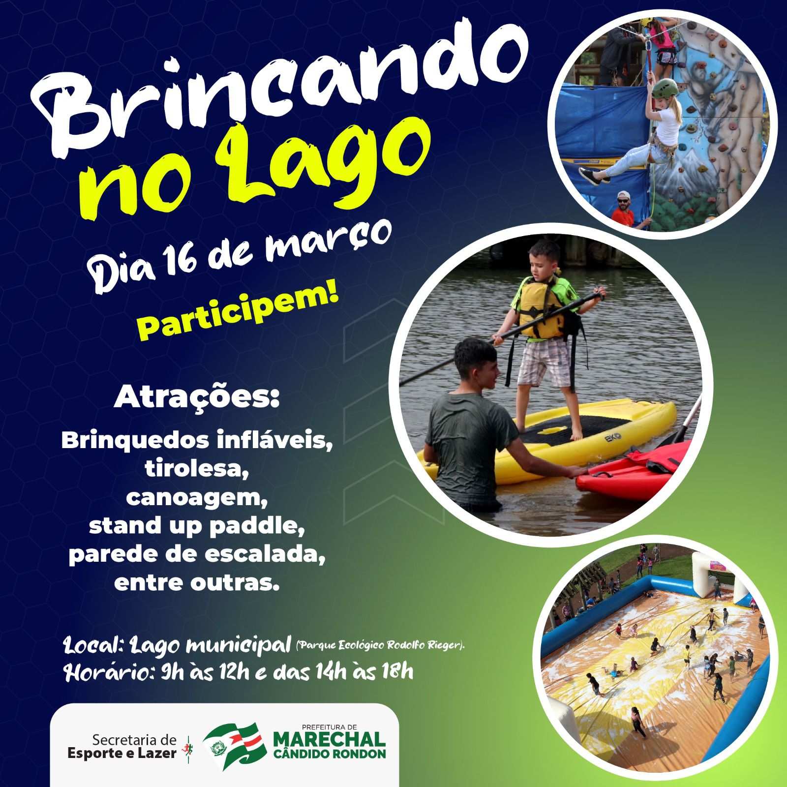 Neste sábado, dia 16, a Secretaria de Esporte e Lazer de Marechal Cândido Rondon realiza mais uma edição do Brincando no Lago, no lago municipal Rodolfo Rieger.