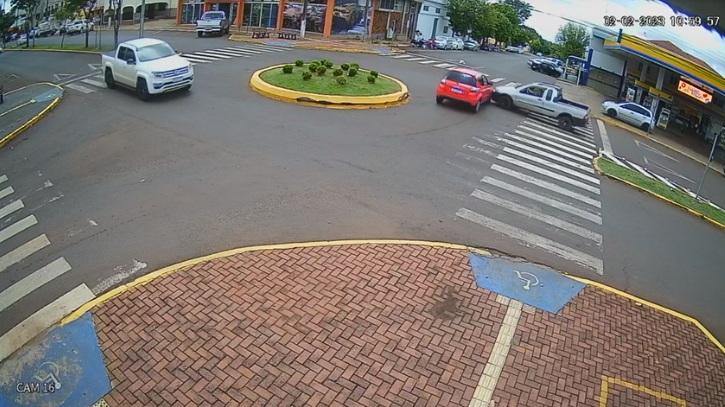 Câmeras de seguranças da Imobiliaria Activa, flagraram o momento da colisão que envolveu um automóvel Ford KA e uma pick up Fiat Strada.