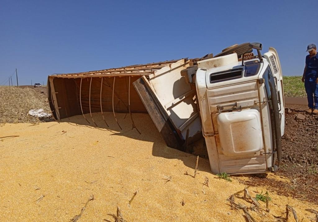 Trata-se de um caminhão carregado com milho que veio a tombar as margens da pista, deixando a carga espalhada em uma lavoura.