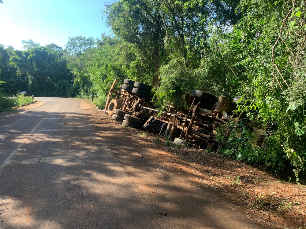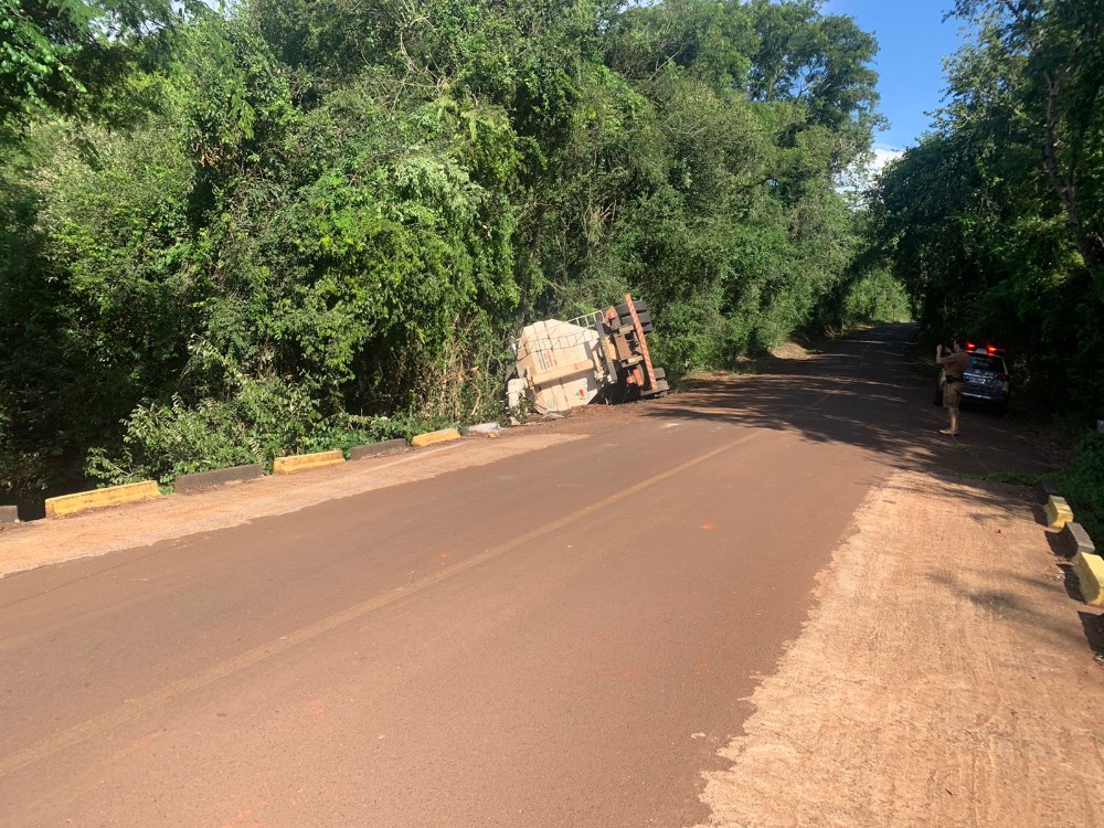 Por volta das 14h30, um caminhão de transporte de ração de uma empresa de Guarapuava, trafegava por uma estrada rural no trecho sede municipal a Linha Dois Vizinhos, quando em uma curva – próximo a ponte do Rio Arroio Fundo, o veículo ficou desgovernado, saiu para o acostamento e tombou, onde desceu um barranco e bateu contra àrvores.