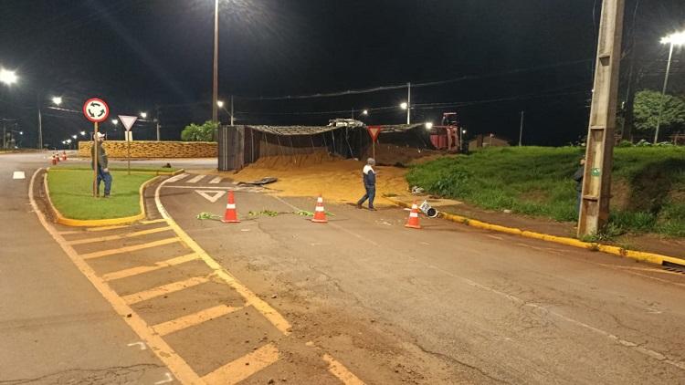 Um caminhão bitrem carregado com 38 toneladas de grãos de soja tombou na noite desta quarta-feira (11) na rotatória que liga a Rua Maripá à Rua Guarani, em Toledo, na saída para o distrito de Dez de Maio.